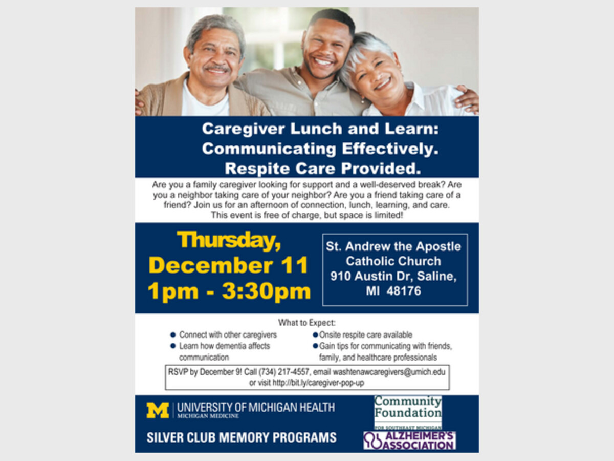 Supporting a friend or family member with dementia? Join Silver Club Memory Programs for a Caregiver Lunch and Learn on Communicating Effectively – featuring free caregiver support, lunch, education, discussion, and onsite respite care! Learn how dementia affects communication and gain tips for communicating with friends, family, and healthcare professionals. Contact washtenawcaregivers@umich.edu or call 734-217-4557 for more information.