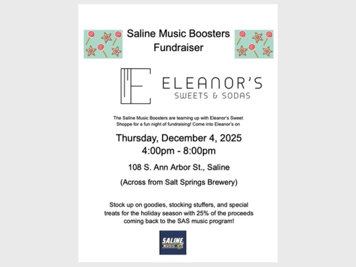 The Saline Music Boosters are teaming up with Eleanor’s Sweet Shoppe for a fun night of fundraising! Thursday, December 4, 2025 4:00pm - 8:00pm. Stock up on goodies, stocking stuffers, and special treats for the holiday season with 25% of the proceeds coming back to the SAS music program!