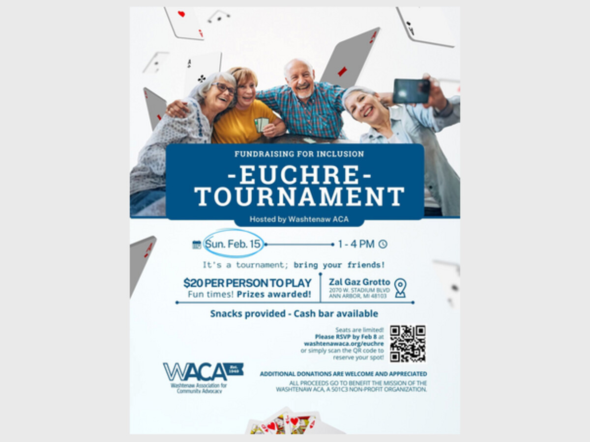 $20 per person to play, snacks provided, cash bar. Please RSVP by February 8. All proceeds go to support the Washtenaw Association to Community Advocacy, a 501(c)3 nonprofit organization. The WACA's mission is to empower people with intellectual and developmental disabilities (IDD) and their families to fully participate in community life. This means we work to ensure that people with disabilities and their families have choices, opportunities, and the supports they need to be fully included in community life through advocacy and education.