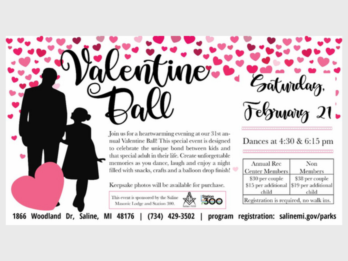 Register for the Daddy Daughter Valentine Ball by calling the Rec Center at (734) 429-3502 or online at Saline WebTrac.