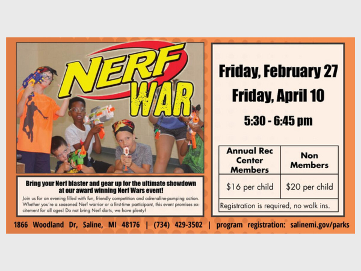 Register for Nerf Wars by calling the Rec Center at (734) 429-3502 or online at Saline WebTrac.