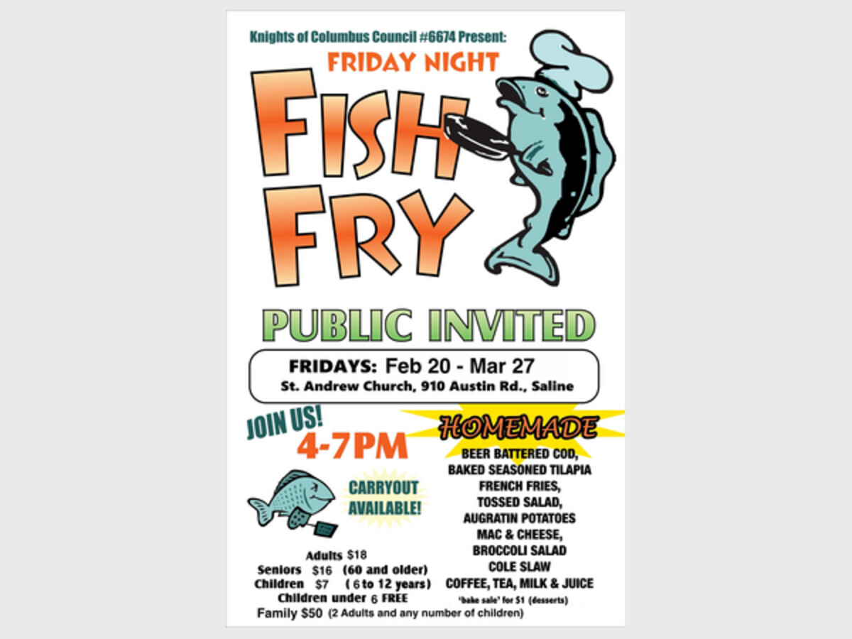 Fish Fry: Saline Knights of Columbus. Baked tilapia, beer-battered fried cod, salad, fries, beverages, homemade cheesy potatoes, broccoli salad, coleslaw, mac & cheese, and "bake sale" for $1 (desserts). 4-7 p.m., St. Andrew’s Catholic Church, 910 Austin, Saline. Adults $18, Senior $16, kids (6-12) $7, Children under 6 free or Family (2 Adults and any number of children) $50.