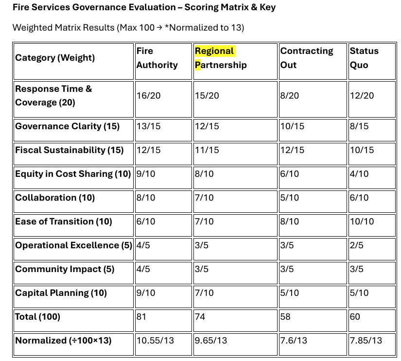 Earlier this year, the city spent $80,000 on a study of fire and emergency services by the Center for Public Safety Management. The study looked at an authority, a city-owned fire department (the city called this regional partnership in its scoring), outsourcing fire and emergency services, and continuing to operate under the fire board. The study looked at governance, cost, emergency response time and other factors. The authority model was ranked as the top choice.