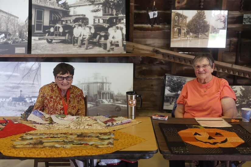 Wilma Armbruster Trachet and Elaine Masters showed off their quits in front of the historic photos in one of the barns.