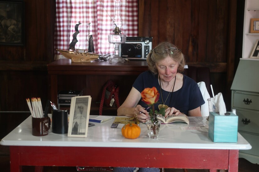 Angie Austin reads while working in the Rentschler Farm gift shop.