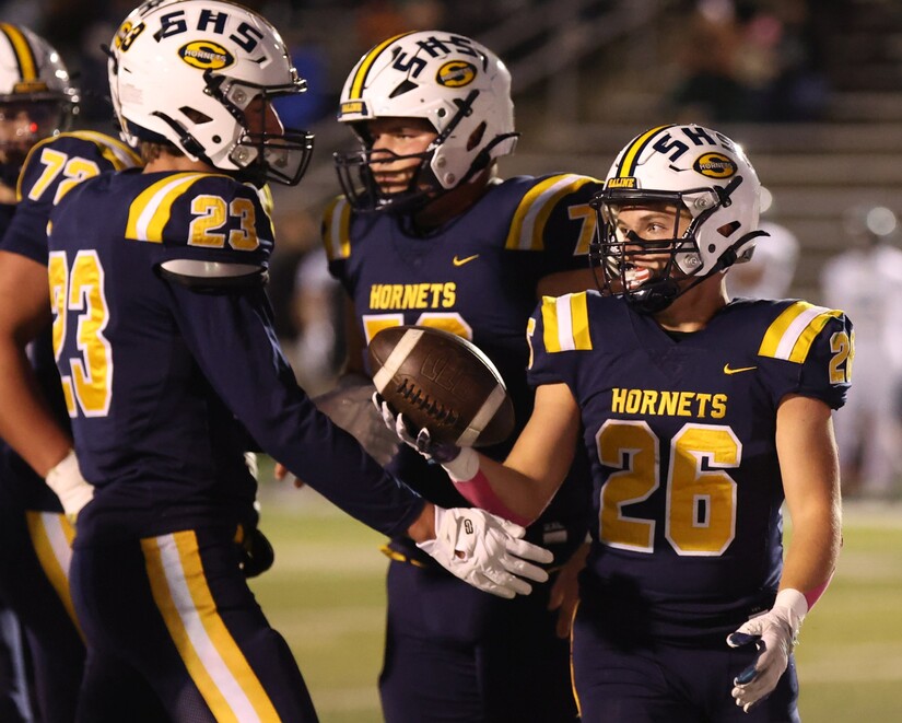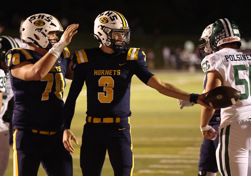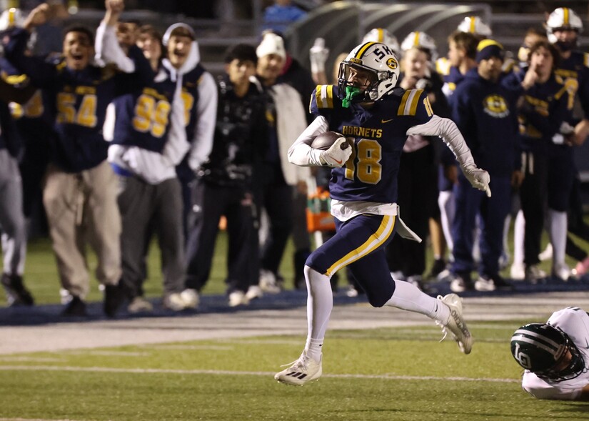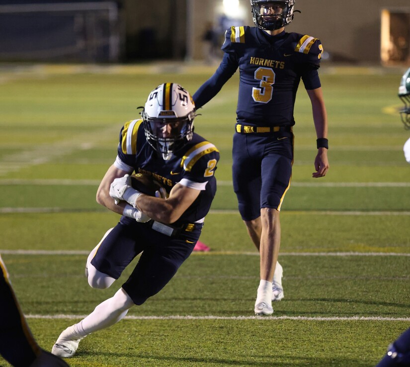 Saline started its next drive at its 37 after a 13-yard return by Griffin Backus with 2:12 remaining. Carr tossed to Keyes, who made a great one-handed catch on first. Then Carr threw to Lucas Fidh for a first. After a broken-up play, Carr threw to Nolan Klein for nine yards. After a penalty on the Hornets, Carr got those yards back and more with a pass over the middle to Keyes.