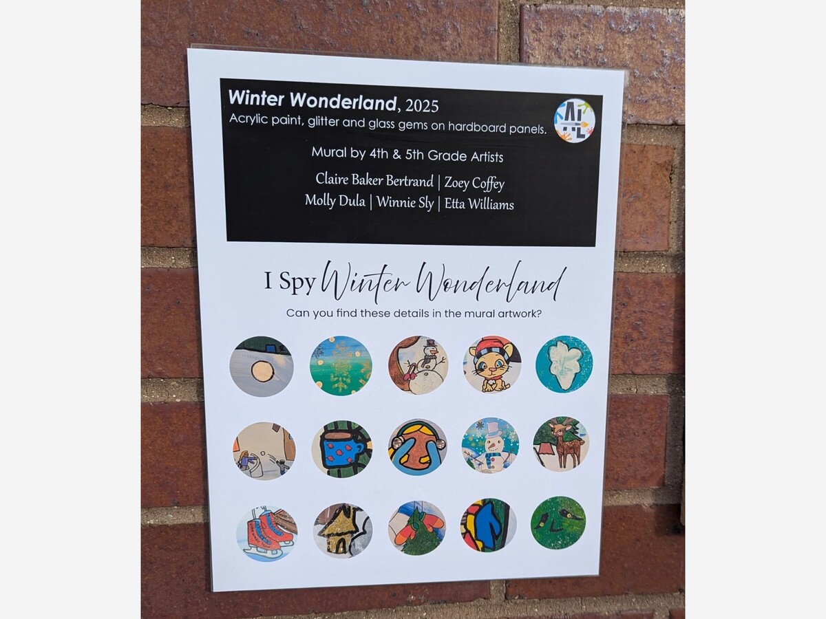 The mural titled "Winter Wonderland" began with each student working on gradients to lay down the sky and snowy hills on two 2 x 2 foot panels for the background. From there, the students went in their own creative direction with the design of their panels. As fourth grader Etta Williams shared, "I was inspired to paint the things I think are fun about winter." Once complete, the panels were combined to create the mural. Students also designed an “I Spy” activity to accompany their mural artwork.