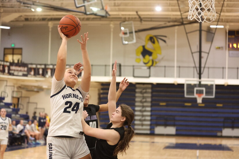 Saline stormed back with a couple of three-pointers by Roehm, and a three and a layup by Myla Talladay. But Pioneer still led until the buzzer ended the first quarter, when Keira Roehm was fouled attempting a three-pointer. Roehm went 2-for-3 and Saline led 14-13 - a lead the Hornets never relinquished.