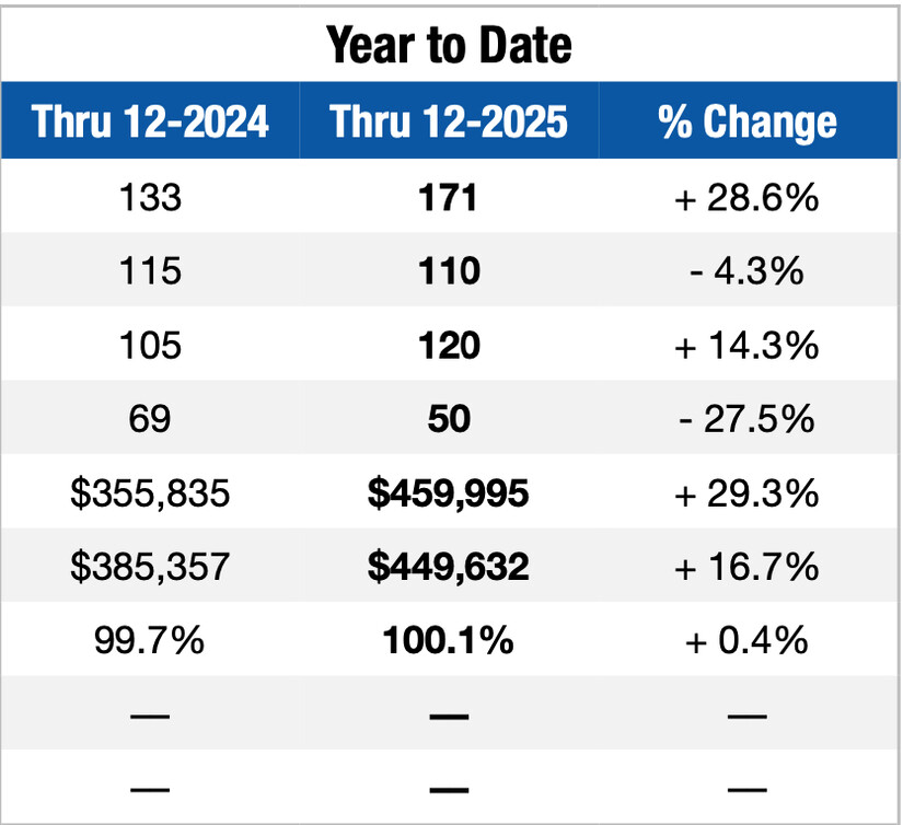 New listings were up for the year. Pending sales were up. Closed sales were up. Days on market were down. Median sales prices were up.