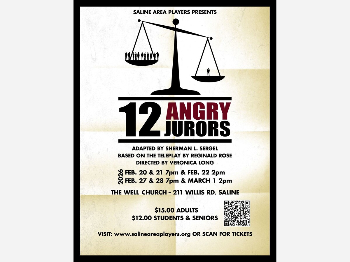 12 Angry Jurors, directed by Veronica Long, runs Feb 20th-Mar 1. Tickets: $15 adults, $12 for stud/seniors. SalineAreaPlayers.org