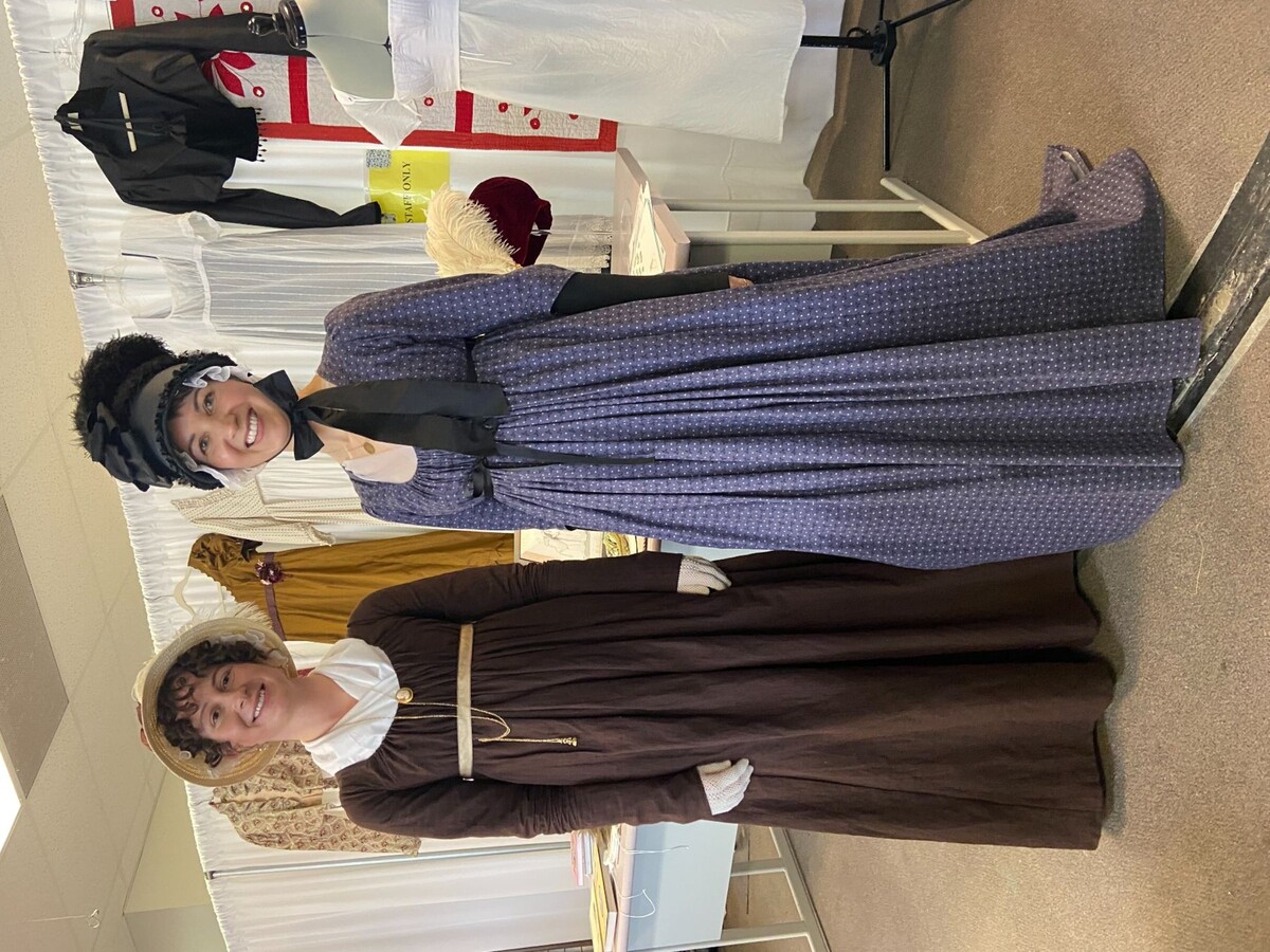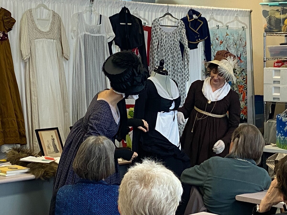 Dressed in full Regency clothing, the pair answered questions from the attendees, explaining everything from hats and gloves to overcoats and undergarments. In addition, they offered a list of resources for anyone interested in pursuing patterns, vendors or suppliers. They also spoke about festivals and events for those hoping to learn more.