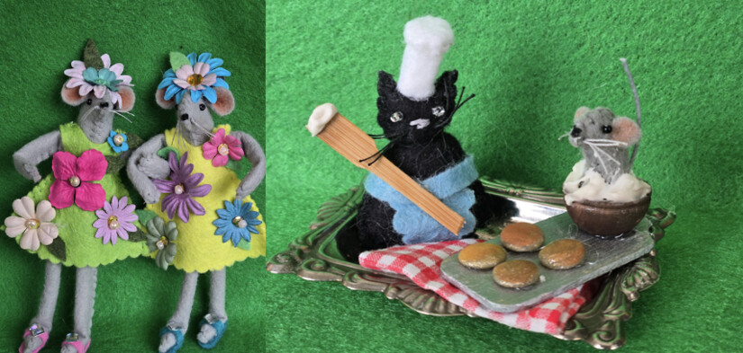 Kirby is making his debut at the Saline Spring Craft Show. He is three quarters of an inch long. He joins Kiki (also three quarters of an inch tall) & their friend the black cat, Mia. Mia measures in at an inch & a half tall. Arriving in Booth 69 again on March 7, DAWN QUICK’s booth can be accessed through GPS in 2 ways—free shuttle bus to the front door of Saline Middle – 7265 N Ann Arbor or free parking at 520 Woodland Dr E. Her smallest critters in the collection will add new colors this spring with the little mice being available in lots of shades of grey, tan & white. Many of the tiny vignettes are one-of-a-kind. All are completely handsewn & hand cut because of their size Dawn doesn't like working with machines ..... besides, machines of any kind scare the little critters! They are all created from the finest wool blend & bamboo felt. This spring Dawn has added many seasonless items which are goodies that are great to have around all year long. Mouse adoption certificates are also available.
