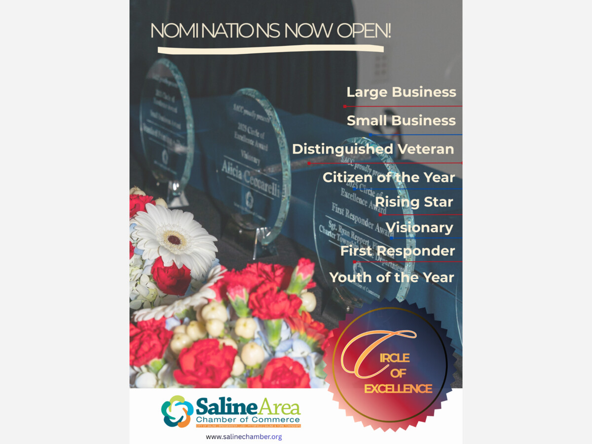 The Saline Area Chamber of Commerce is proud to announce that nominations for the 2026 Circle of Excellence Awards are open. The program is the chamber's most prestigious recognition. It celebrates outstanding individuals and organizations that enrich the Saline area community.