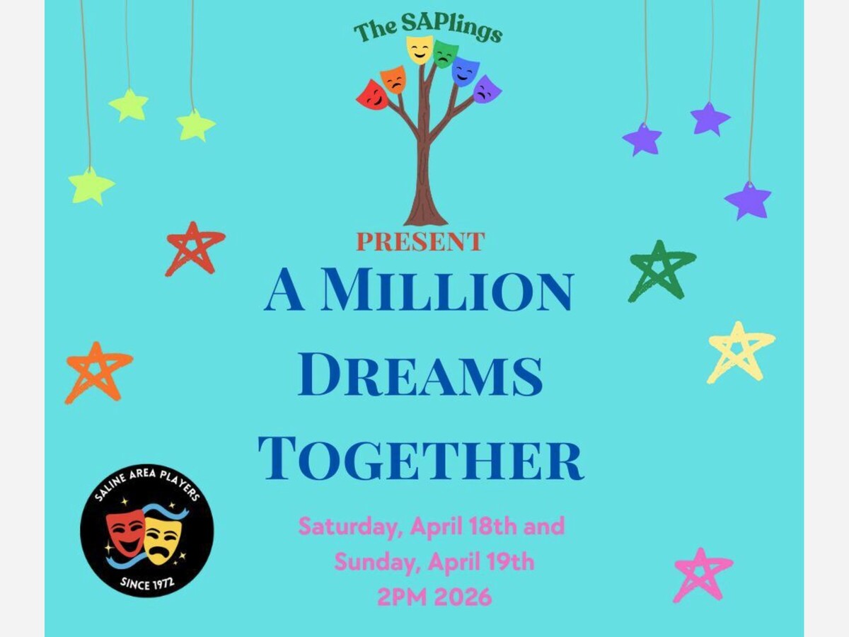 The SAPlings (Saline Area Players youngsters) Present "A Million Dreams Together" showcase at 2 p.m., Saturday, April 18 and Sunday, April 19 at the Well Church, 211 Willis Road, in Saline.