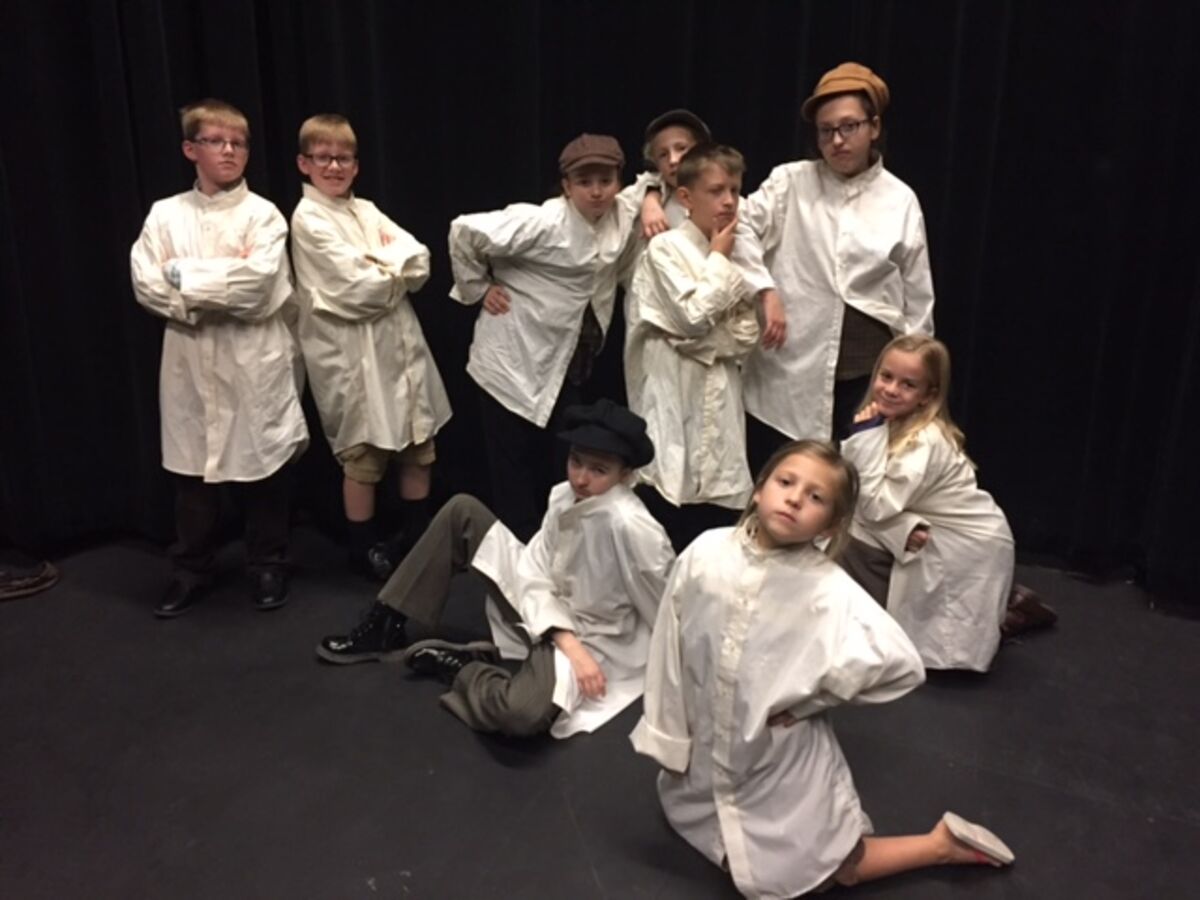 Of note, she states that is has been a “real feat” trying to outfit 29 kids in the show in a short time frame during a whirlwind of activity with busy rehearsals. For example, she managed to find 29 white dress shirts which she then stained with tea and coffee in her bathtub. These are used in the workhouse scene. Her favorite character so far to costume has been Mr. Bumble, the pompous beadle of the orphan poorhouse. She states that she made him a mace, had to add all kinds of lace to his costume, fashioned some knickers, and topped it off by spray painting a special hat, taking the whole can of paint. She is always on the lookout for costume pieces and has looked at (mostly thrift) shops as far away as Fenton and Gaylord. Also, in preparation for this show, she has been collecting metal beer steins for the last year that will be used during one of the popular songs from the show, Oom Pah Pah.